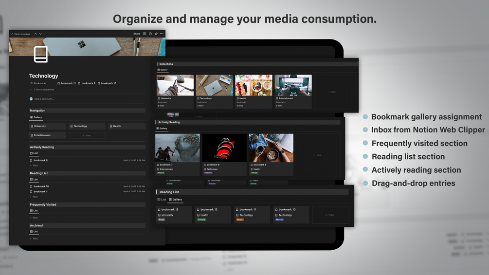 Through the Notion Web Clipper, keep track of articles, websites, tools, and more.