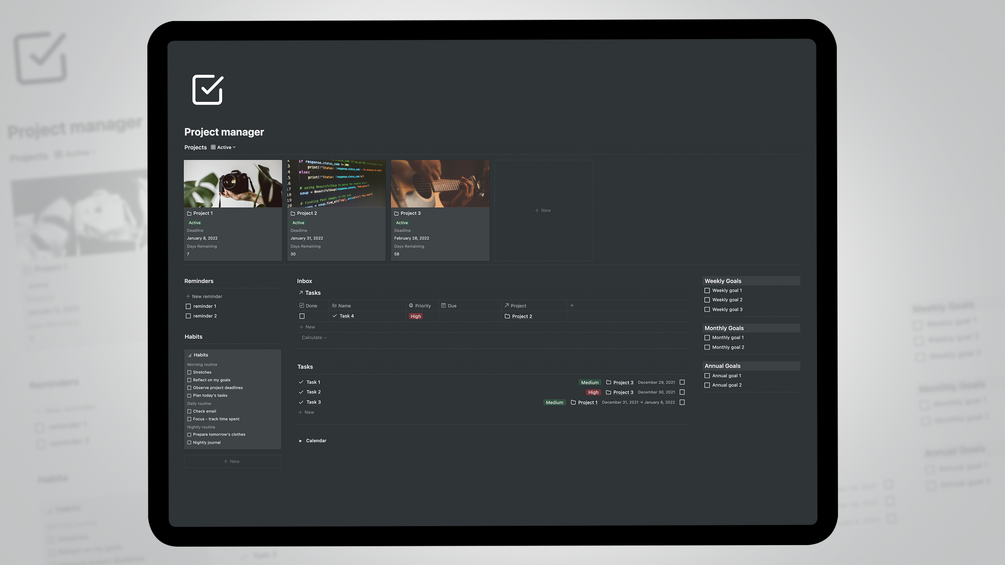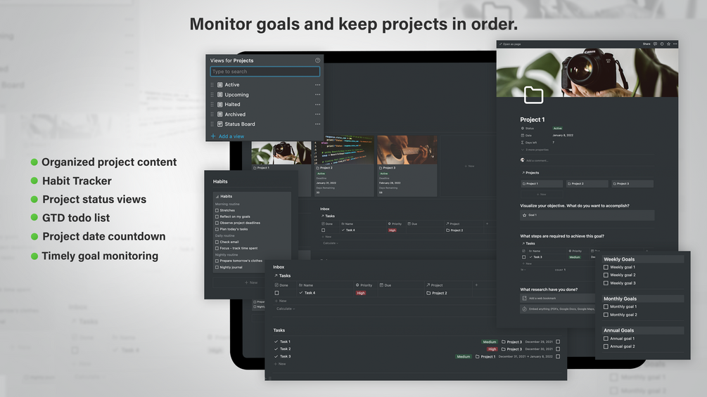 With this free project / task manager template, keep track of active projects, monitor deadlines, keep track of goals, develop new habits, and more.
