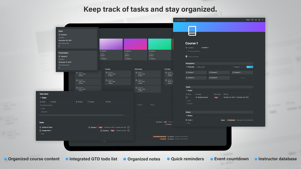 With this free and simple university template, keep track of tasks, notes, events, and more. Get more organized and get back some more time.